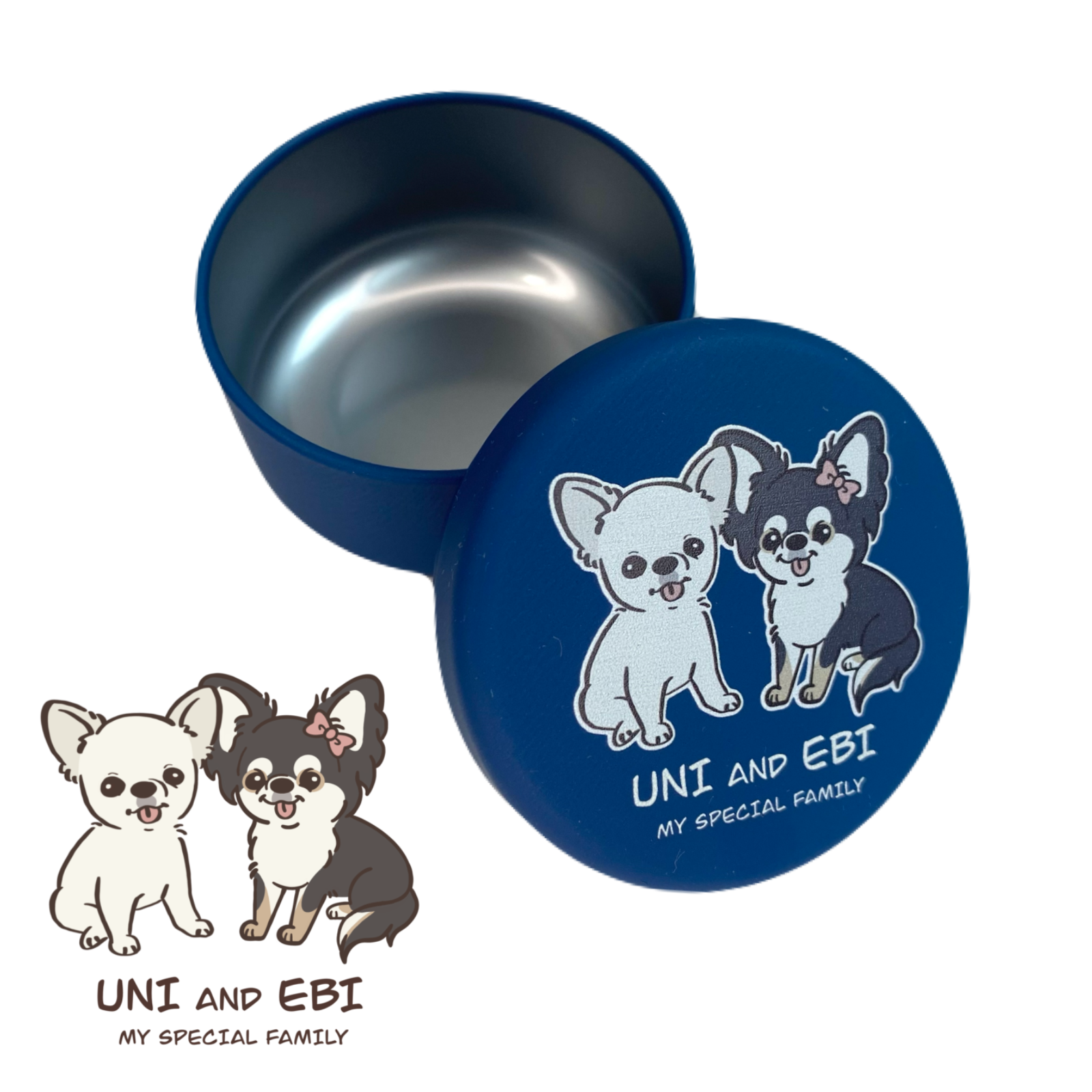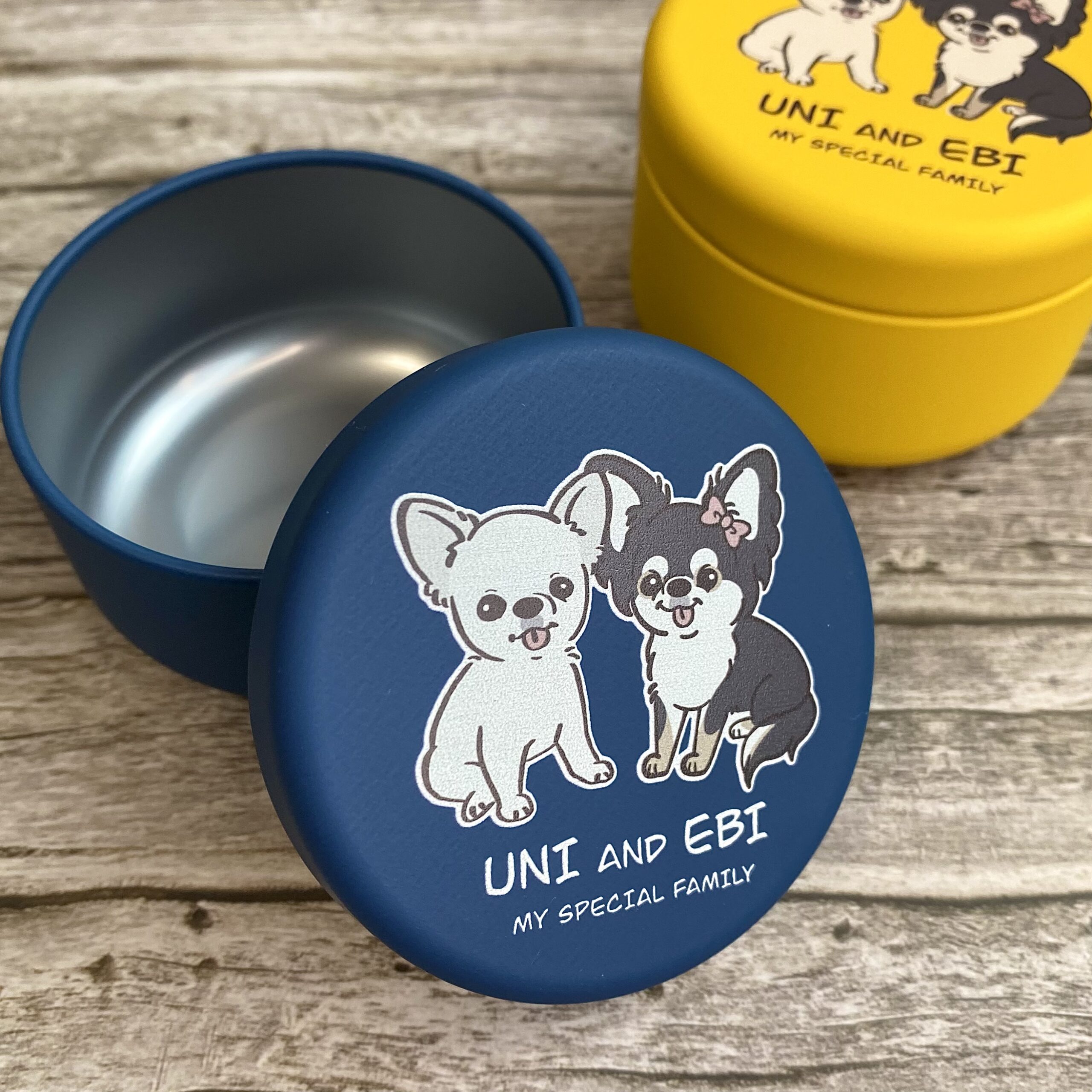 こちらはuni&ebiちゃんのゆるふわテイスト、お座りデザインのおやつ缶になります♪